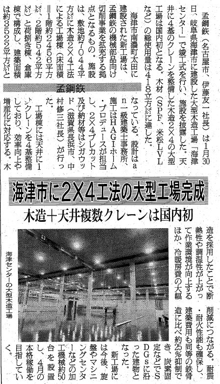 2026年2月4日発行の「日刊木材新聞」において、弊社が躯体制作しました孟鋼鉄様の新工場「海津センター」が紹介されましたのでお知らせいたします。