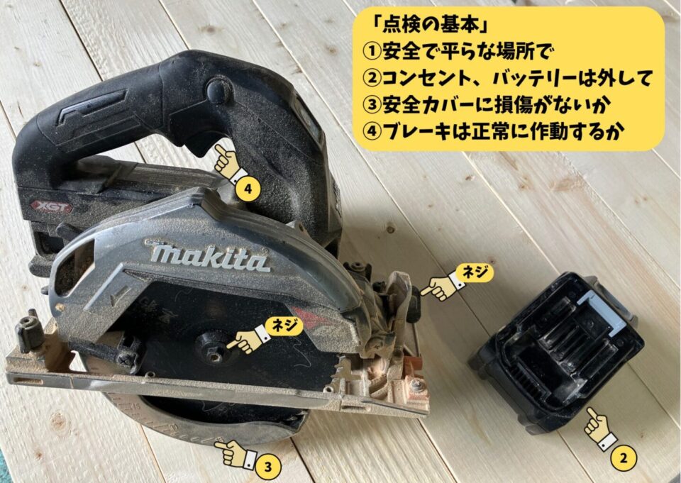 ②コンセント、バッテリーは外して、丸鋸が冷えた状態で行うこと。